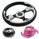 NRG-SRK-110H+001SL+650PK, NRG Innovations 12.5" 320mm Black Leather Silver Trim Racing Steering Wheel Combo with 6 Hole Short Hub Adapter with Gen 3.0 with Handle Pink Quick Release Kit SRK-110HNRG Quick Release features many options that conventional ball-locking quick release system do not. It is specially engineered with raised sections to prevent the scratching and stretching of the hub while a self locking feature adds increased safety and functionality. Features racing styled for added style and look. Each unit is made from the highest quality aircraft grade aluminum and is anodized for maximum durability and finish.