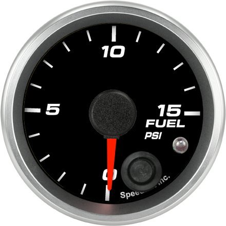 Speedhut 2-1/16" Fuel Pressure Gauge 0-15psi (w/ warning) An internal microprocessor controls the needle movement through a digital stepper motor. The high torque of the stepper motor ensures accurate pointer movement without vibration in all race conditions. A high accuracy electronic (.5-4.5v) pressure transducer is included with the gauge for highest accuracy. Fuel is isolated at the transducer within the engine compartment. No fuel isolator necessary. Setable warning LED. Set low and high conditions. Peak recall shows both min and max peaks. A super thin (easy for gauge pods) composite carbon case design allows easy mounting in tight locations. Bright annodized solid Aluminum bezel! A unique Spin lock ring is included for ease of installation and a total custom look.